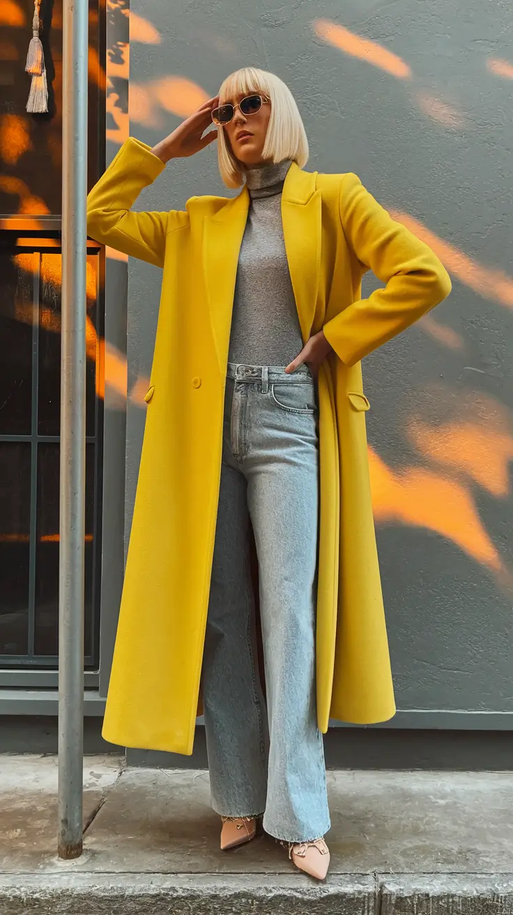 Questo cappotto giallo Γ¨ una vera esplosione di energia! Perfetto per illuminare le giornate grigie e portare un tocco di allegria al tuo look autunnale. Abbinato a un dolcevita grigio e jeans a gamba larga, crea un outfit super trendy e originale.