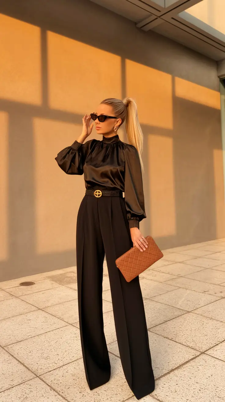 Il nero non passa mai di moda! Questo outfit Γ¨ la prova che anche un look total black puΓ² essere super chic. La blusa in raso con maniche a sbuffo, abbinata ai pantaloni a palazzo, crea una silhouette elegante e sofisticata. La cintura con fibbia dorata definisce la vita, mentre la pochette matelassΓ© aggiunge un tocco di lusso. Il segreto? Scegli tessuti di alta qualitΓ per un look impeccabile.