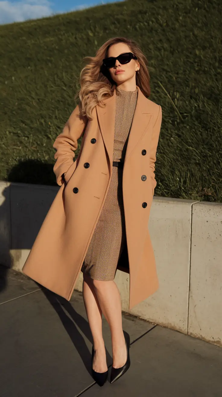 Un cappotto cammello Γ¨ un investimento sicuro per l’autunno. Questo modello, lungo e avvolgente, Γ¨ perfetto per affrontare le giornate piΓΉ fredde con stile. Abbinato a un abito a quadri e dΓ©colletΓ© nere, crea un look sofisticato e senza tempo.