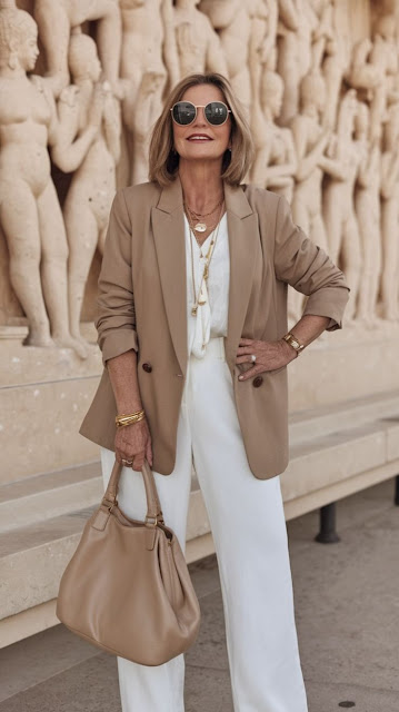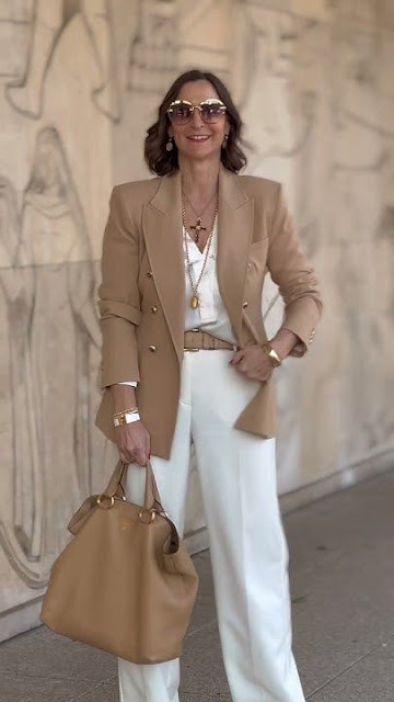 Ecco un altro esempio di come indossare un blazer cammello con stile! Abbinato a pantaloni bianchi e accessori neutri, crea un look sofisticato e impeccabile. La borsa oversize Γ¨ perfetta per portare con sΓ© tutto il necessario.