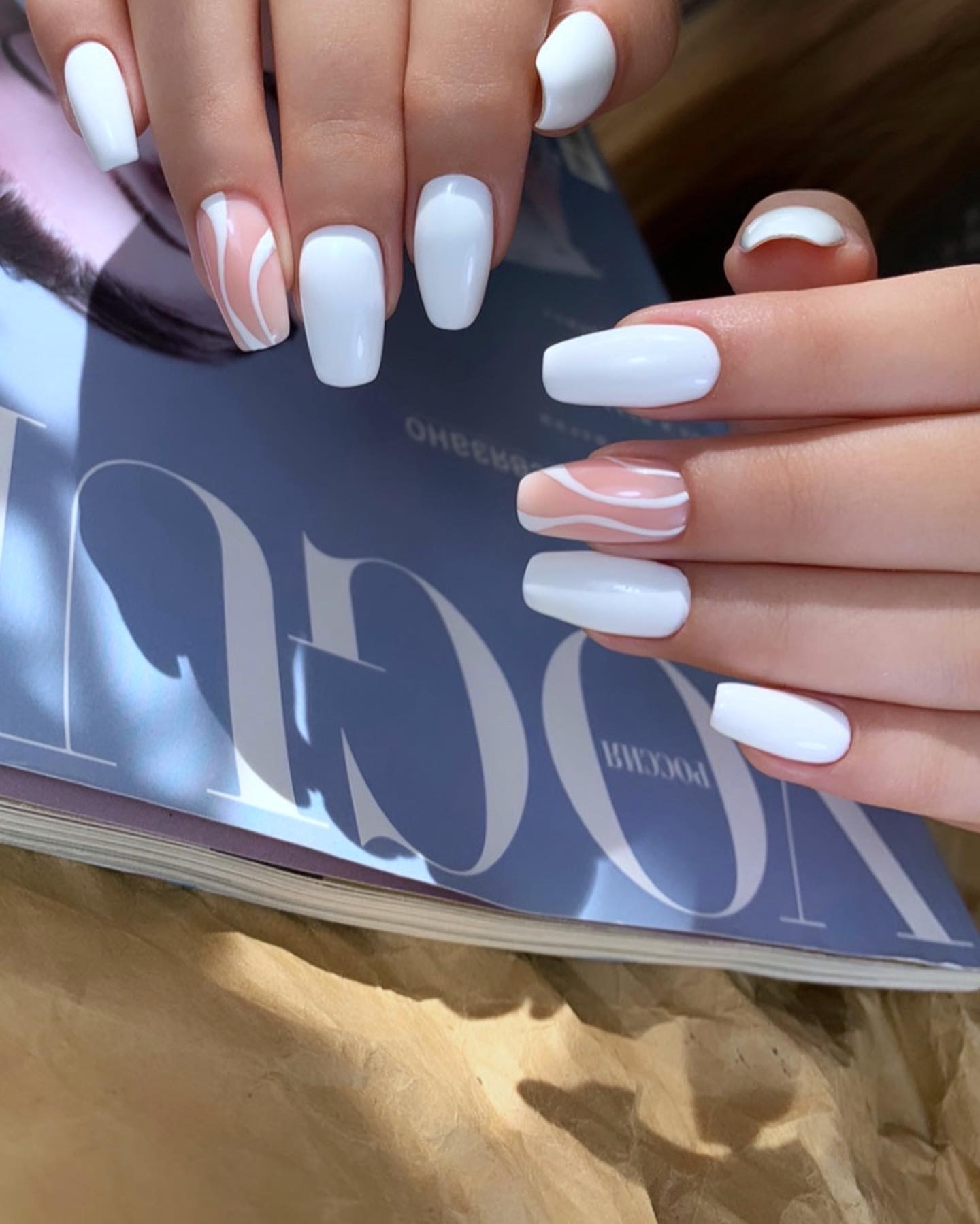 Unghie squadrate eleganti e moderne con un design astratto bianco e nude. Le linee sinuose aggiungono un tocco dinamico. Perfette per un look sofisticato da ufficio o un aperitivo con le amiche. Consiglio: utilizza un pennello sottile per creare le linee curve con precisione.