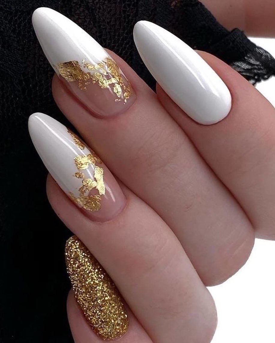 Unghie a mandorla che brillano! L’oro e il bianco si combinano per creare un look lussuoso, ideale per una serata speciale o le feste. Il glitter dorato su un’unghia accentua il design. Consiglio: per un effetto foglia oro piรน duraturo, applica un ulteriore strato di top coat sopra le decorazioni.