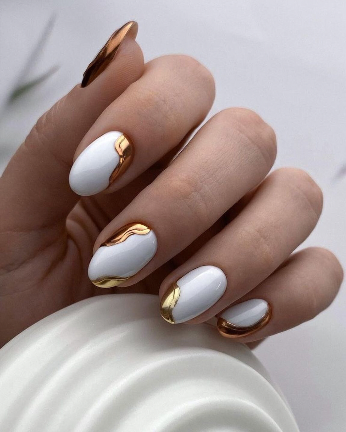 La semplicitร del bianco incontra l’opulenza dell’oro in questo design dalle linee sinuose. Le onde dorate creano un effetto elegante e raffinato, perfetto per una serata speciale o un’occasione importante. Consiglio: per un risultato preciso, utilizza un pennello sottile per disegnare le onde dorate.